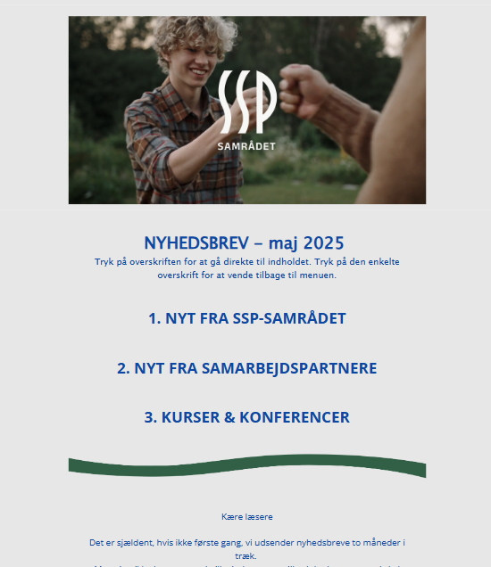 Kære læsere Det er sjældent, hvis ikke første gang, vi udsender nyhedsbreve to måneder i træk. Men vi er ikke herrer over, hvilke indsatser og tilbud der kommer, og I skal selvfølgelig ikke snydes for relevante tilbud og aktiviteter! Det gælder specifikt gå-hjem-møderne om UKN, som VIVE afholder i næste uge! Så tøv ikke med at dykke ned i nyhedsbrevet for maj!