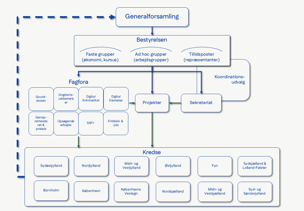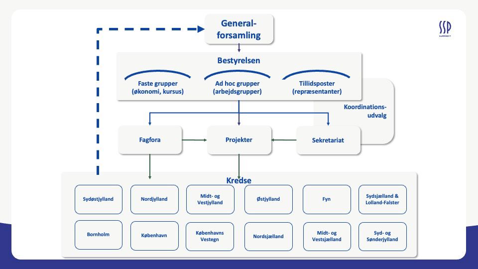 Generalforsamlingen udgør vores øverste myndighed, hvor hver medlemskommune har én stemme. Bestyrelsen består af repræsentanter fra de 12 SSP-kredse, en forperson og kasserer, og sætter retningen for organisationens mål og indsatser.